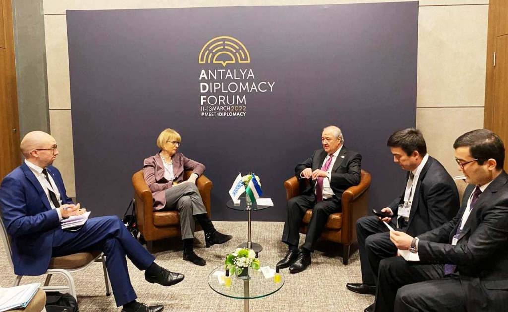 2022-yil 11-mart kuni Antaliya shahrida bo‘lib o‘tadigan ikkinchi diplomatik forumda ishtirok etish uchun Turkiyaga tashrif buyurgan O‘zbekiston Respublikasi Tashqi ishlar vaziri Abdulaziz Kamilov Yevropada Xavfsizlik va hamkorlik tashkiloti Bosh kotibi Helga Shmid bilan uchrashdi.