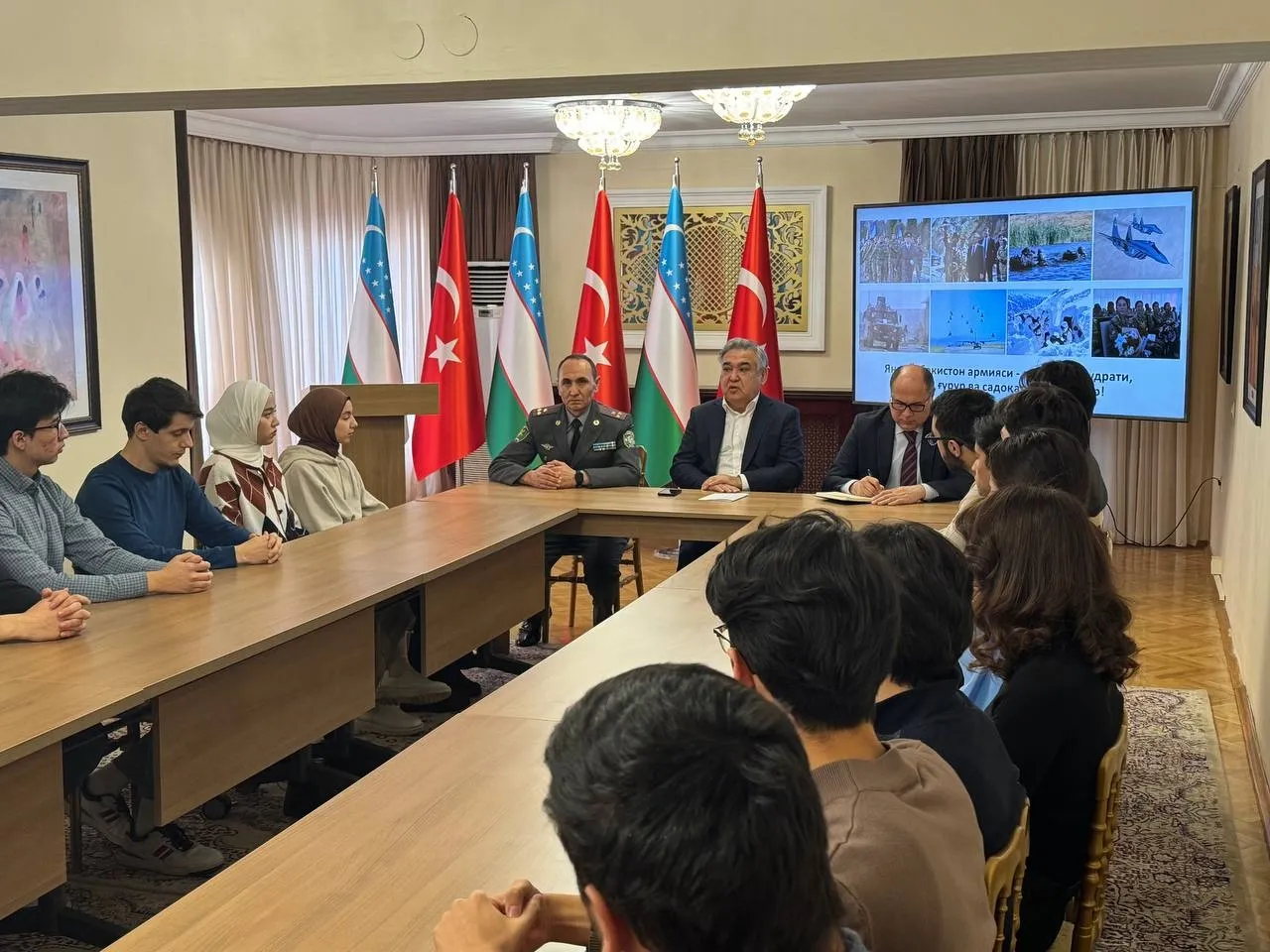 ANQARA, 15-yanvar. /«Dunyo» AA/. Mamlakatimiz elchixonasida Anqara shahrida joylashgan oliy ta’lim muassasalarida o'qiyotgan talabalar va vaqtincha bo'lib turgan O'zbekiston fuqarolari ishtirokida Qurolli Kuchlarimiz tashkil etilganligining 32 yilligi hamda Vatan himoyachilari kunini nishonlashga bag'ishlangan «Yangi O'zbekiston armiyasi — mamlakat qudrati, yuksak g'urur va sadoqat timsolidir!» mavzusida ma’naviy-ma’rifiy tadbir o'tkazildi, deb xabar bermoqda «Dunyo» AA muxbiri.