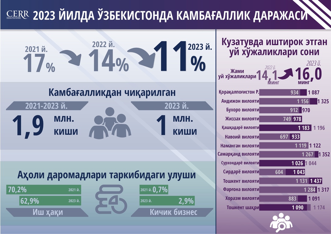 Иқтисодий тадқиқотлар ва ислоҳотлар маркази Статистика агентлиги ва Жаҳон банки билан биргаликда Ўзбекистондаги монетар камбағаллик даражасини баҳолади. 2023 йилда мамлакатда камбағаллик даражаси 3,1% бандига пасайгани қайд этилди.